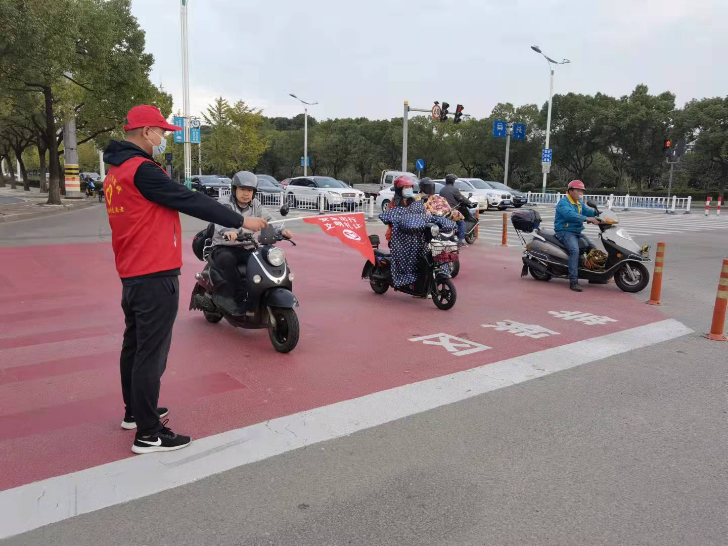 集團(tuán)干部職工對(duì)擔(dān)負(fù)(青少年宮北路——北三環(huán))交通路口進(jìn)行交通違法行為勸阻及道路交通秩序維護(hù),引導(dǎo)機(jī)動(dòng)車在有交通信號(hào)燈的斑馬線前主動(dòng)禮讓,對(duì)行人不走人行道、闖紅燈、翻越護(hù)欄等行為進(jìn)行勸阻,勸阻非機(jī)動(dòng)車等紅燈時(shí)超越停車線、闖紅燈、違規(guī)載人、在人行道上騎行等交通違法行為。